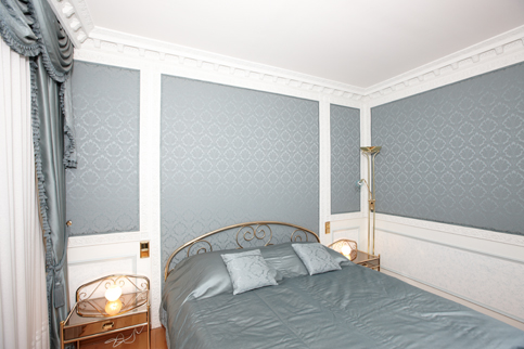 Weiße Bordüre auf dunklen Hintergrund – so könnte auch Ihr Schlafzimmer aussehen.